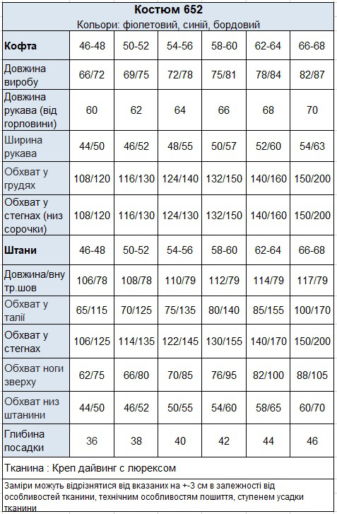 Кофтинка вільного крою, рукав спущений, маленькі розрізи з боків. Штани вільного крою, пояс на резинці, місткі кишені. Виготовлений із якісної тканини, середньої щільності. Тканина м'яка, стрейчева і водночас приємна до тіла, не кусається. Костюм стане одним із улюблених у гардеробі. Підійде на свято.